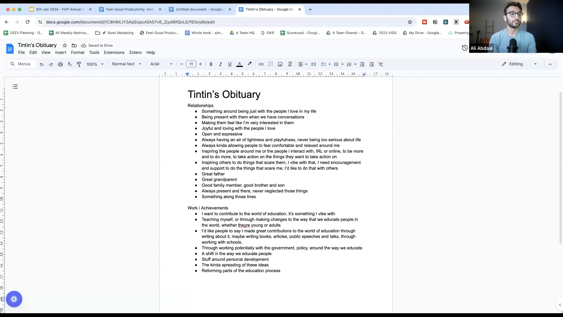 上圖是 Ali 和他的團隊隊員 Tintin 在工作坊中的示範,將訃聞練習分為 relationship 和 work/achievement 兩個部分,快速列出幾個希望出現在訃聞中的 bullet points,再用 ChatGPT 草擬初稿後進行修改。