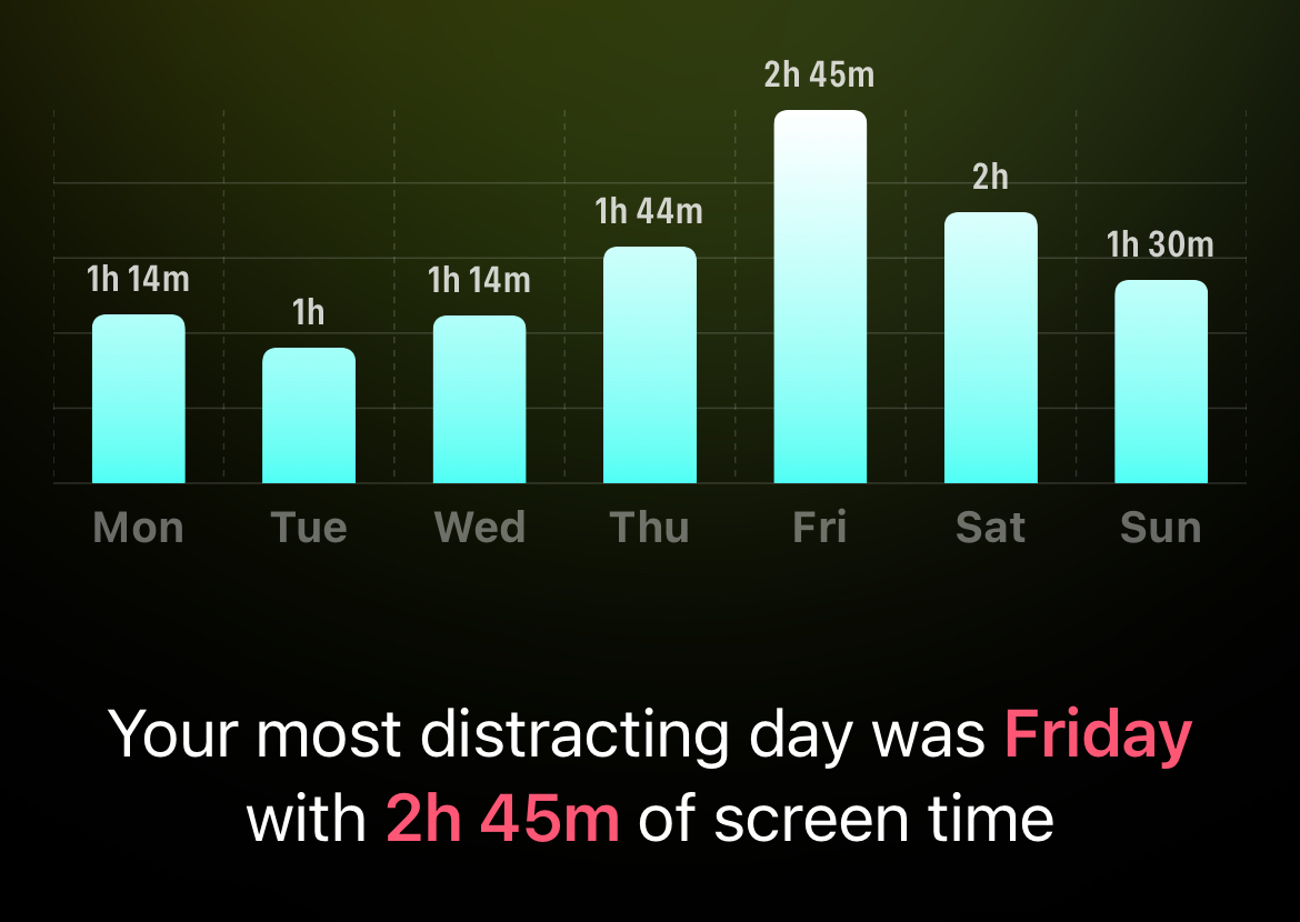 目前決定實作方法是,管控整週的手機螢幕使用時數低於 10 個小時。平均分配就是每天最多 1.5 小時,週六或週日則是 1 個小時。