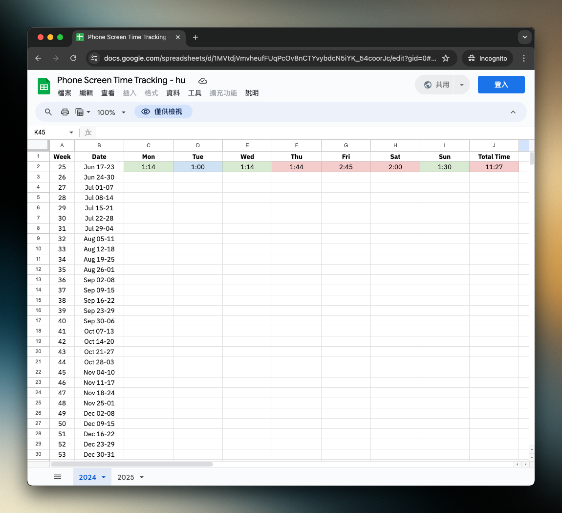 這邊是我接下來的 Screen Time Tracker - Google Sheet。