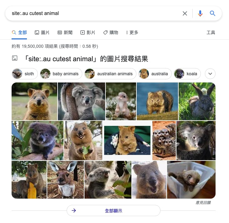 使用情境:搜尋澳洲最可愛的動物,因為疫情影響,出國變成一件遙不可及的事,除了喜歡搜尋山海的照片,定期幫電腦換一下桌布,我也會偶爾搜尋不同國家的可愛動物洗洗眼睛。(*附上所有國家和地區頂級域)