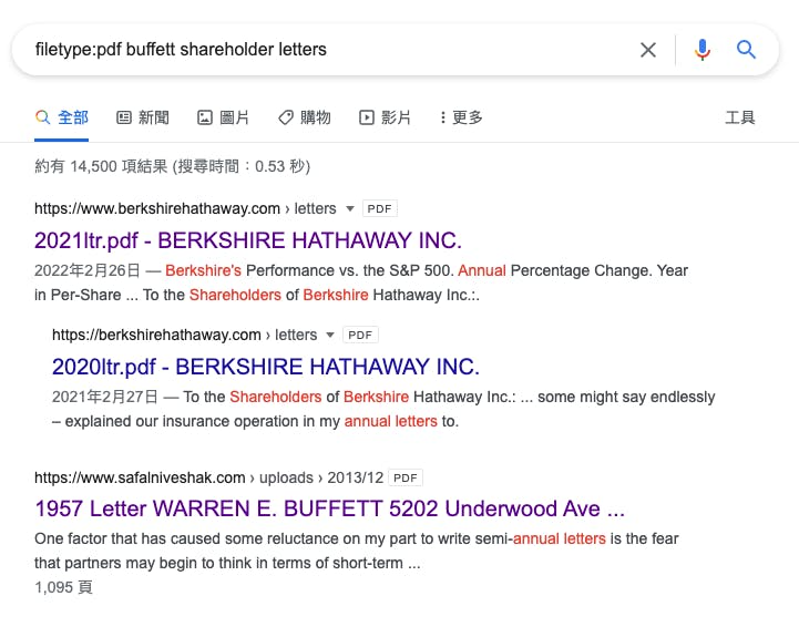 搜尋檔案格式 PDF+巴菲特股東信,就能得到他連續 57 年的年度股東信。