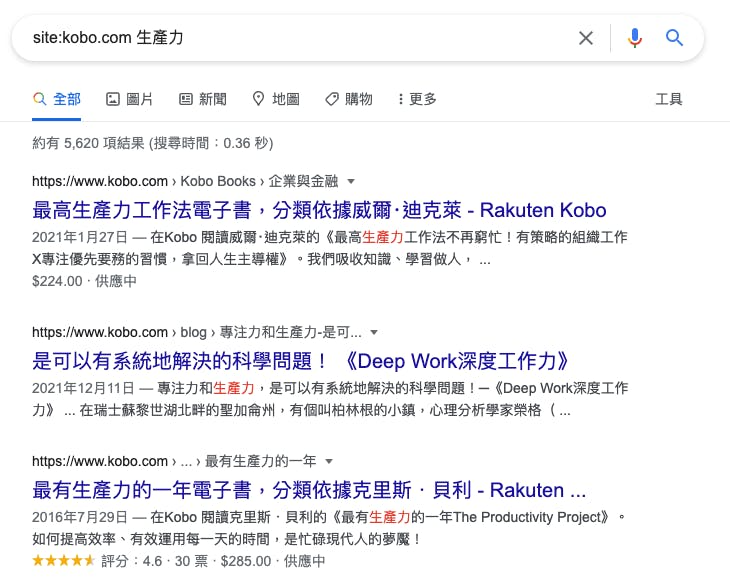 使用情境:我用的電子書平台是 KOBO,如果對哪個議題或分類有興趣的書,除了上台北圖書館查找之外,我最常用 KOBO 站內搜尋關鍵字,就能馬上查到相關的書籍。