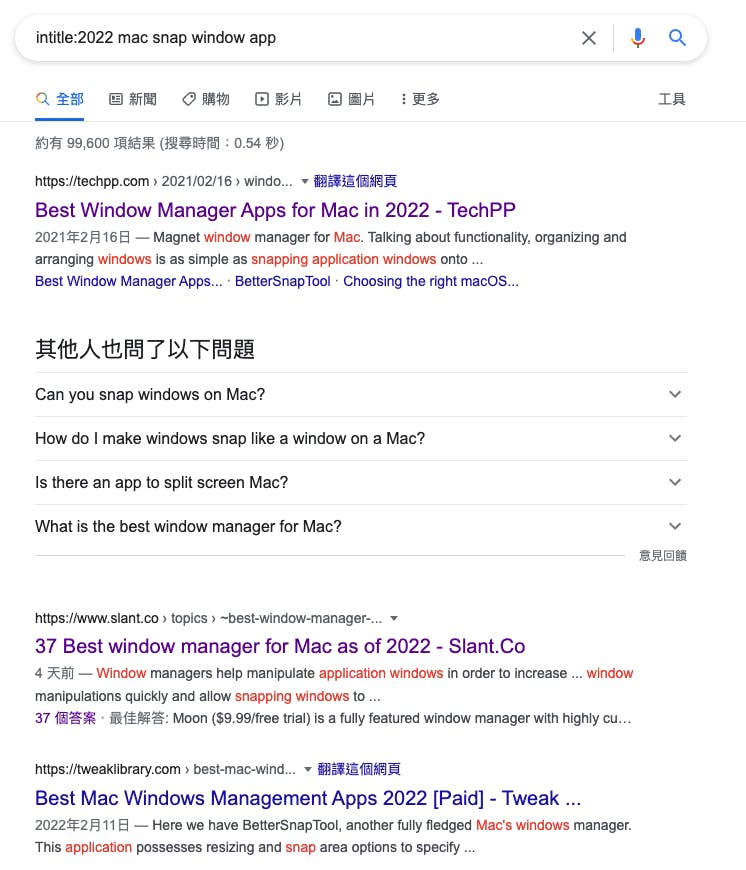 使用情境:原本只用 BetterTouchTool 設定移動滑鼠,將視窗黏在左右和四個角落,在想說有沒有其他分割視窗更好用的 app,就用上面的搜尋方式找到 Tiles,超讚。