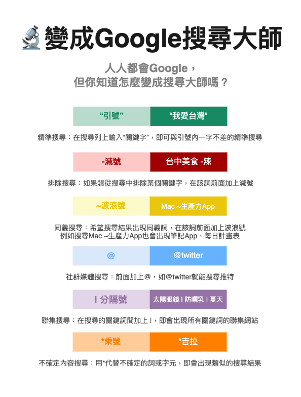 - 排除搜尋 (-減號):想從搜尋中排除某個關鍵詞,在該詞前面加上減號。
