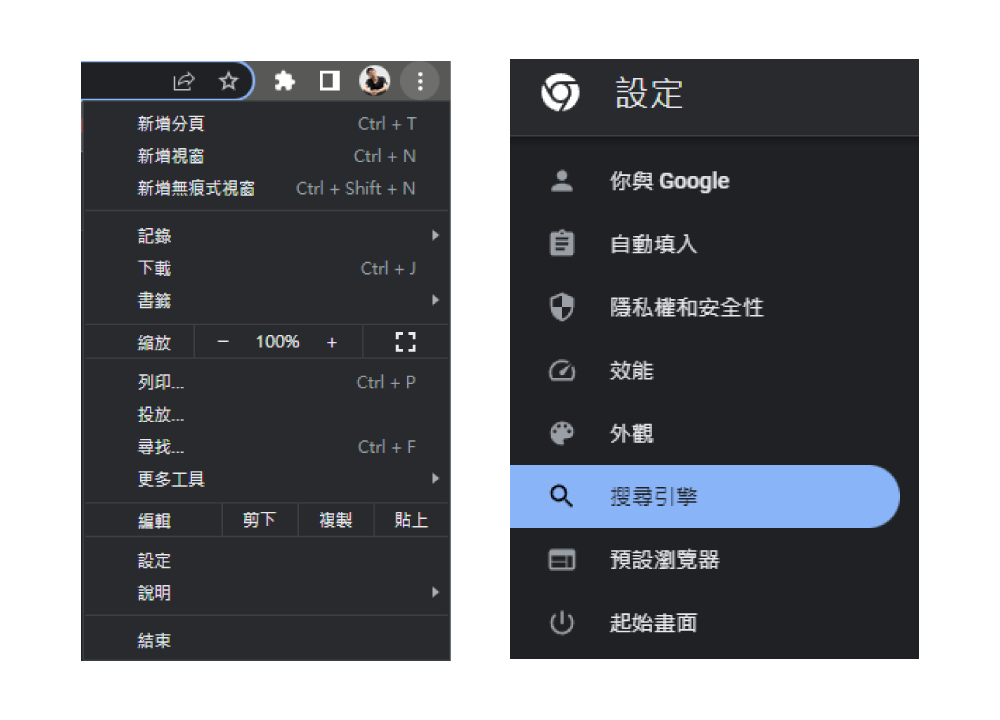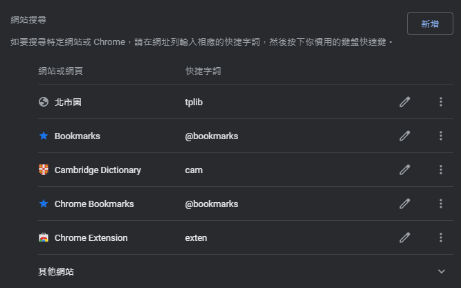 - 在網址列輸入 “chrome://settings/searchEngines”