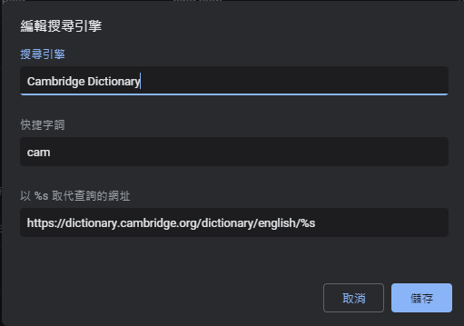 - 取代網址:https://dictionary.cambridge.org/dictionary/english/%s